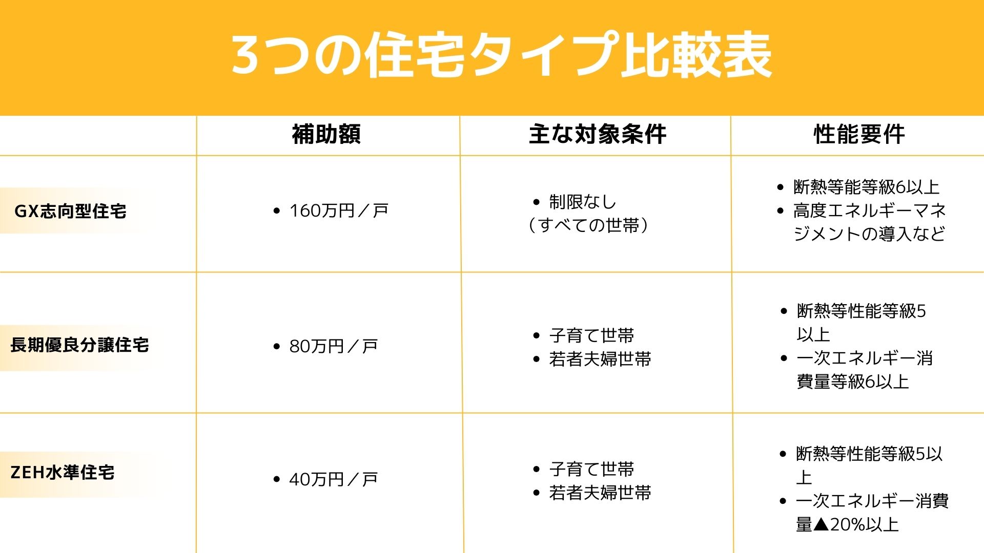 2025年度は「GX志向型住宅」が新たに補助対象に加わり、以前の住宅補助支援よりも補助額が増加しています。今回の補助対象は「GX志向型住宅」「長期優良住宅」「ZEH水準住宅」の3タイプです。