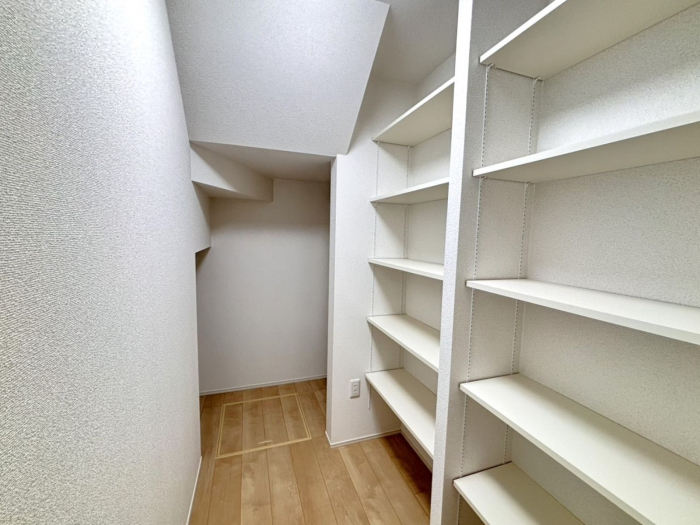 タオルや着替え、洗剤のストック品など何でも収納できる大きな物入。