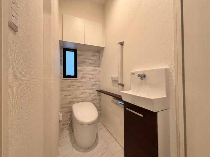 ペーパーホルダー脇の収納キャビネットに加え、備え付け収納を設置。トイレットペーパー(12個入)を袋ごと収納できる奥行を確保しています。