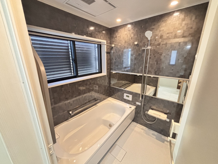 少し大きめ1717(1坪)サイズ。バリアフリー仕様のシステムバス。保温材付きの魔法びん浴槽。お掃除ラクラクほっカラリ床。
