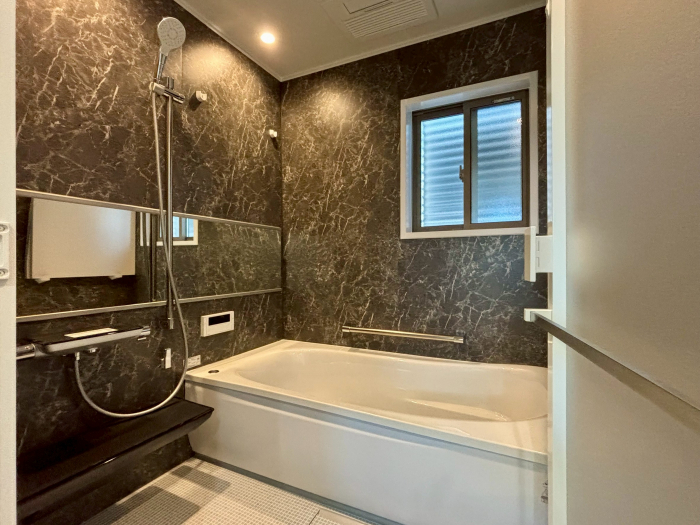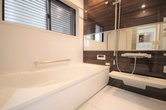 少し大きめ1717(1坪)サイズ。バリアフリー仕様のシステムバス。保温材付きの魔法びん浴槽。お掃除ラクラクほっカラリ床。