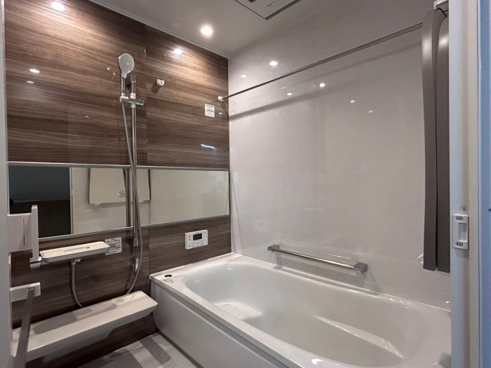 少し大きめ1717(1坪)サイズ。バリアフリー仕様のシステムバス。保温材付きの魔法びん浴槽。お掃除ラクラクほっカラリ床。