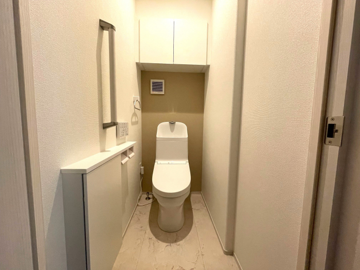 ペーパーホルダー脇の収納キャビネットに加え、備え付け収納を設置。トイレットペーパー(12個入)を袋ごと収納できる奥行を確保しています。
