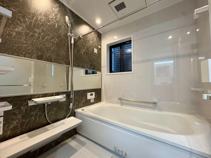 少し大きめ1717(1坪)サイズ。バリアフリー仕様のシステムバス。保温材付きの魔法びん浴槽。お掃除ラクラクほっカラリ床。