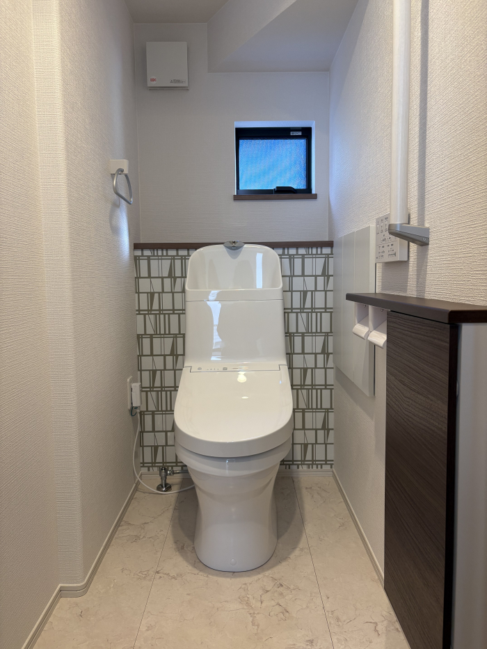 ペーパーホルダー脇の収納キャビネットに加え、備え付け収納を設置。トイレットペーパー(12個入)を袋ごと収納できる奥行を確保しています。