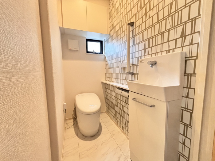ペーパーホルダー脇の収納キャビネットに加え、備え付け収納を設置。トイレットペーパー(12個入)を袋ごと収納できる奥行を確保しています。