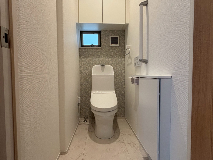 ペーパーホルダー脇の収納キャビネットに加え、備え付け収納を設置。トイレットペーパー(12個入)を袋ごと収納できる奥行を確保しています。