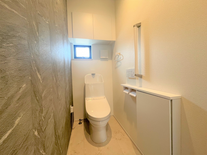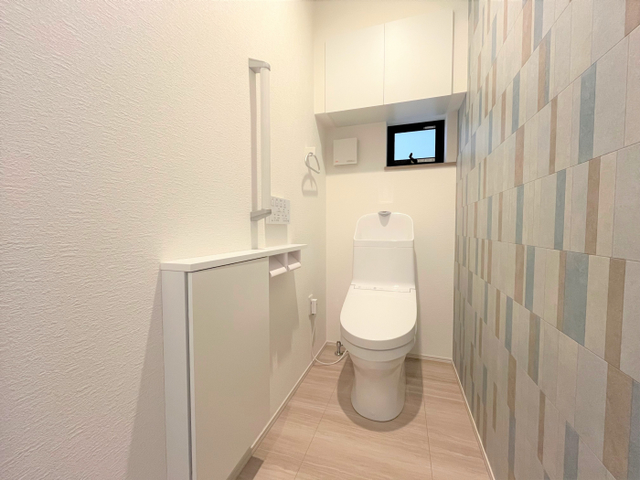 ペーパーホルダー脇の収納キャビネットに加え、備え付け収納を設置。トイレットペーパー(12個入)を袋ごと収納できる奥行を確保しています。
