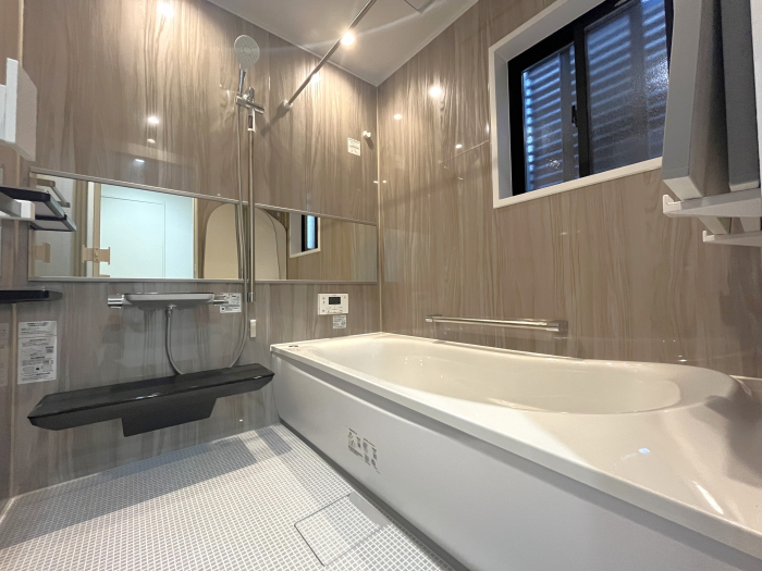 少し大きめ1717(1坪)サイズ。バリアフリー仕様のシステムバス。保温材付きの魔法びん浴槽。お掃除ラクラクほっカラリ床。