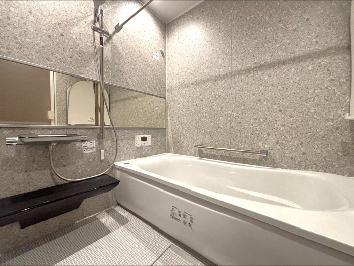 少し大きめ1717(1坪)サイズ。バリアフリー仕様のシステムバス。保温材付きの魔法びん浴槽。お掃除ラクラクほっカラリ床。