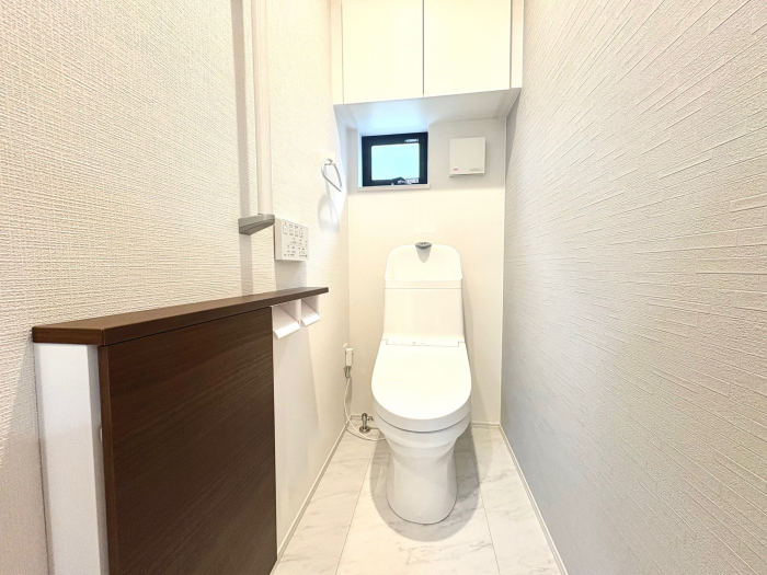 ペーパーホルダー脇の収納キャビネットに加え、備え付け収納を設置。トイレットペーパー(12個入)を袋ごと収納できる奥行を確保しています。