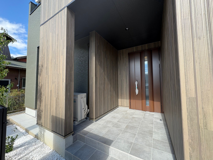 扉を閉めれば玄関はいつも綺麗。土間なのでベビーカーや砂のついたおもちゃもそのまましまえます。