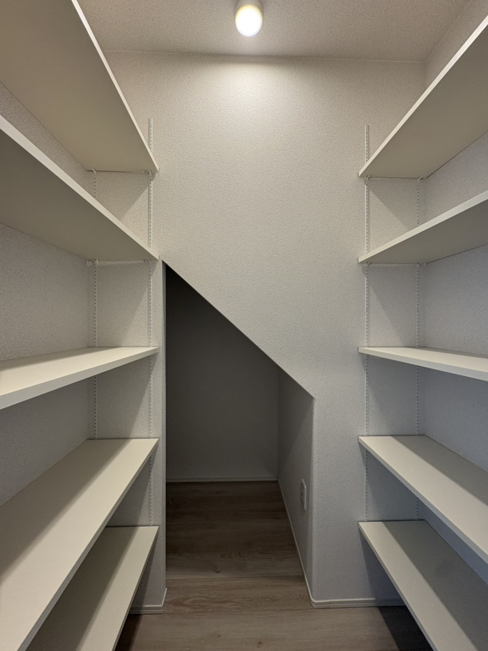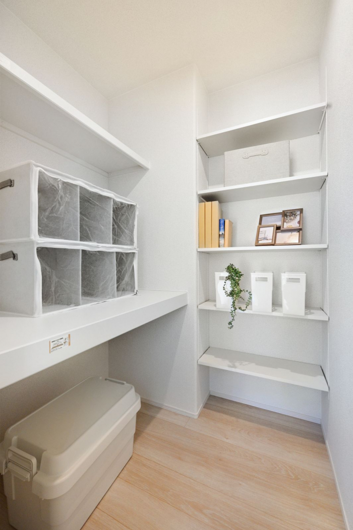 タオルや着替え、洗剤のストック品など何でも収納できる大きな物入。