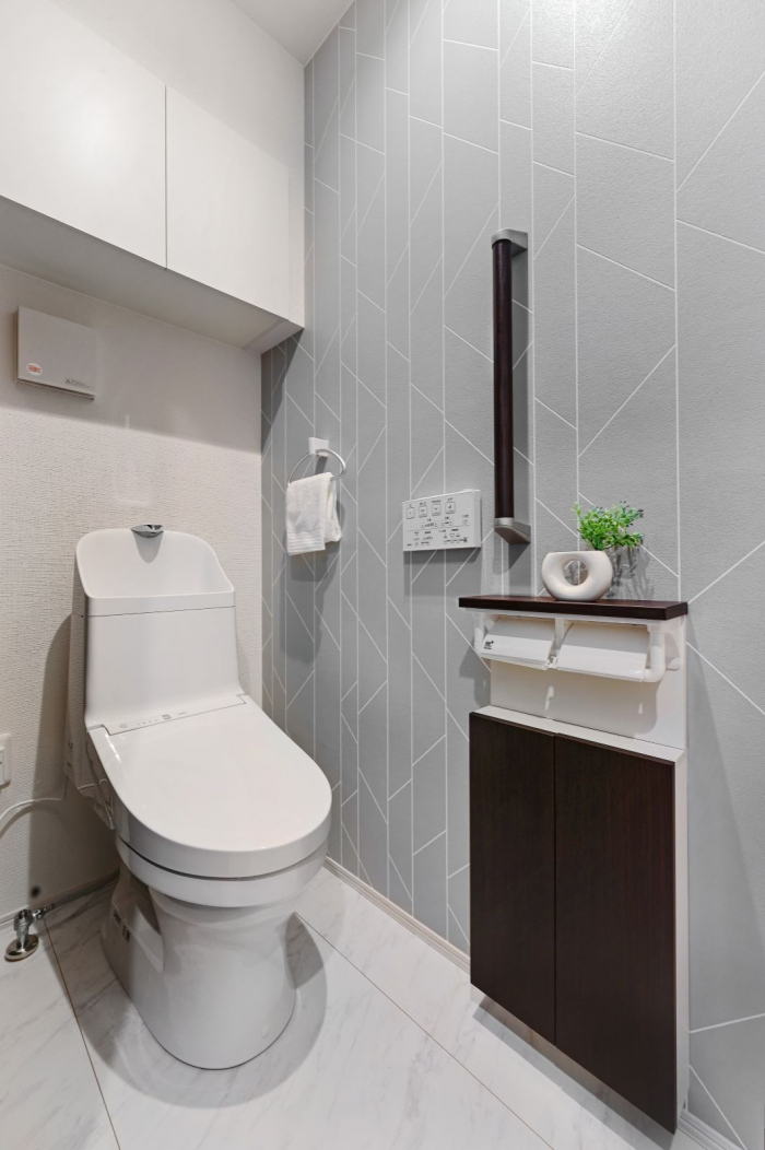 ペーパーホルダー脇の収納キャビネットに加え、備え付け収納を設置。トイレットペーパー(12個入)を袋ごと収納できる奥行を確保しています。