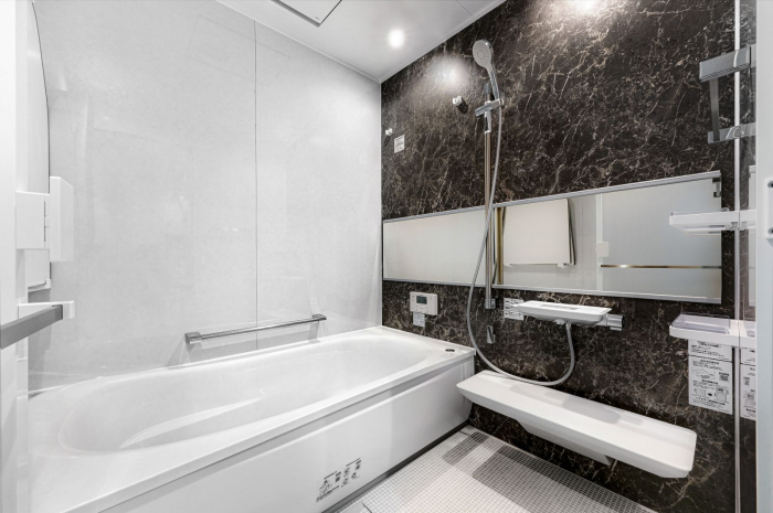 少し大きめ1717(1坪)サイズ。バリアフリー仕様のシステムバス。保温材付きの魔法びん浴槽。お掃除ラクラクほっカラリ床。