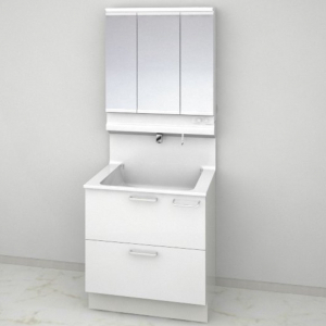2段引き出しタイプのキャビネットはたっぷりの収納スペースがあるので、収納物がひと目で見渡せます。水栓・すべり台ボウル、タッチレスワイドLED・エコミラーなど工夫がいっぱい。ゆとりある洗面空間を実現。