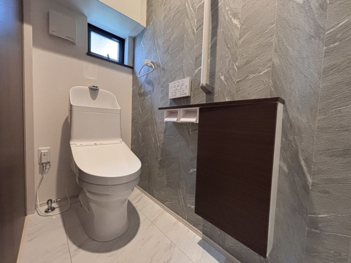ペーパーホルダー脇の収納キャビネットに加え、備え付け収納を設置。トイレットペーパー(12個入)を袋ごと収納できる奥行を確保しています。
