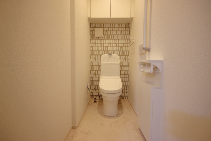 ペーパーホルダー脇の収納キャビネットに加え、備え付け収納を設置。トイレットペーパー(12個入)を袋ごと収納できる奥行を確保しています。