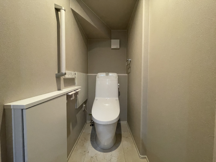ペーパーホルダー脇の収納キャビネットに加え、備え付け収納を設置。トイレットペーパー(12個入)を袋ごと収納できる奥行を確保しています。