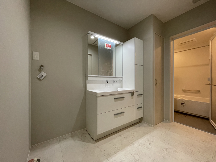 お掃除ラクラク、鏡の後ろにもたっぷり収納できるシャンプードレッサー。