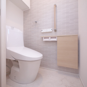 ペーパーホルダー脇の収納キャビネットに加え、備え付け収納を設置。トイレットペーパー(12個入)を袋ごと収納できる奥行を確保しています。