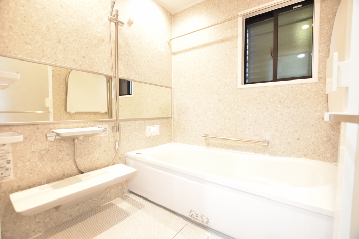 少し大きめ1717(1坪)サイズ。バリアフリー仕様のシステムバス。保温材付きの魔法びん浴槽。お掃除ラクラクほっカラリ床。