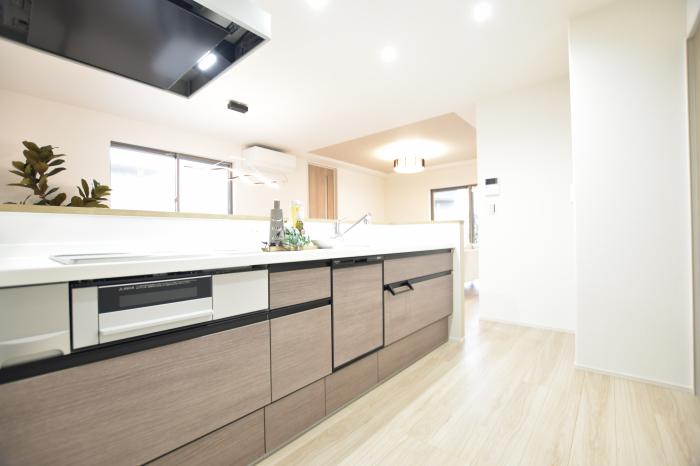 庫内が深く容量も大きい深型食洗機。たくさんの食器、鍋やフライパンなど大きな調理器具も一緒に洗えて便利。奥までフルに引き出せて、真上からラクにセット可能。