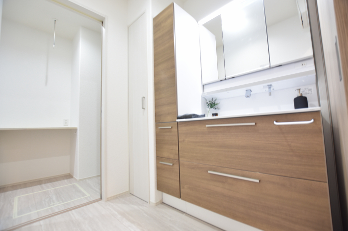 お掃除ラクラク、鏡の後ろにもたっぷり収納できるシャンプードレッサー。