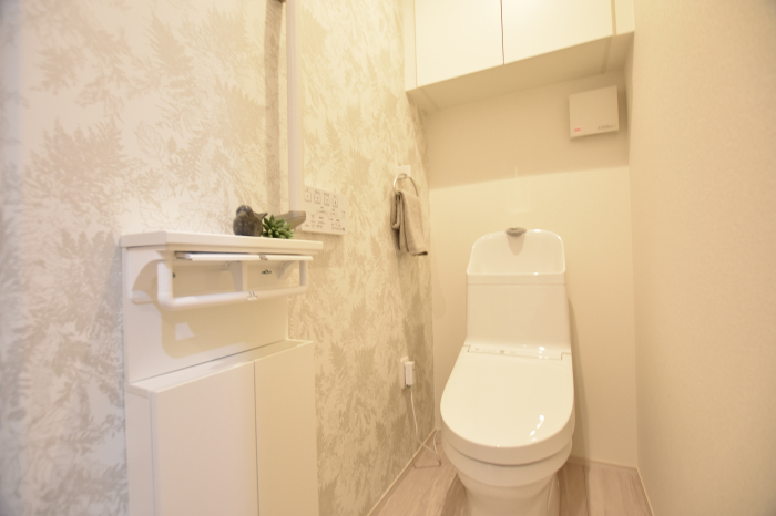 ペーパーホルダー脇の収納キャビネットに加え、備え付け収納を設置。トイレットペーパー(12個入)を袋ごと収納できる奥行を確保しています。