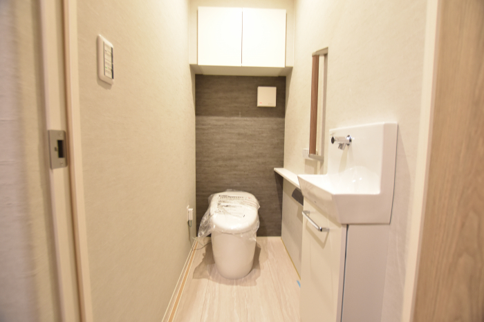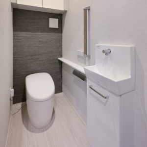ペーパーホルダー脇の収納キャビネットに加え、備え付け収納を設置。トイレットペーパー(12個入)を袋ごと収納できる奥行を確保しています。