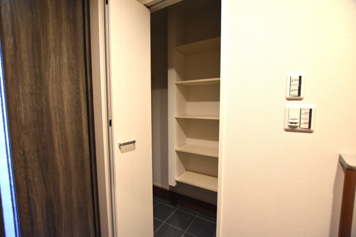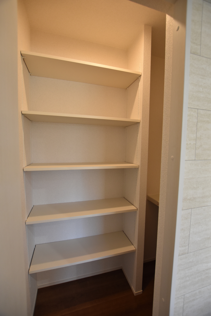 タオルや着替え、洗剤のストック品など何でも収納できる大きな物入。