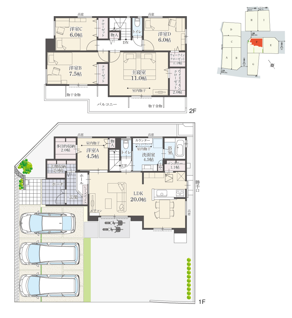 ・駐車台数は、区画図または各間取り図に表示の自動車サイズを想定しております。車種によっては駐車台数が異なる場合があります。