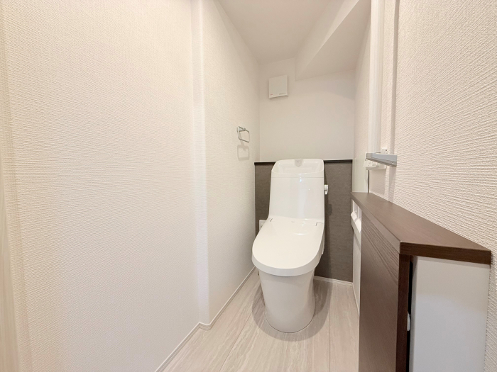 ペーパーホルダー脇の収納キャビネットに加え、備え付け収納を設置。トイレットペーパー(12個入)を袋ごと収納できる奥行を確保しています。