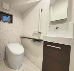 フチなし形状&トルネード洗浄でお掃除ラクラク。ハイブリッドエコロジーシステムで洗浄水量を約7割カット。(手洗い器付ドレッサー設置)
