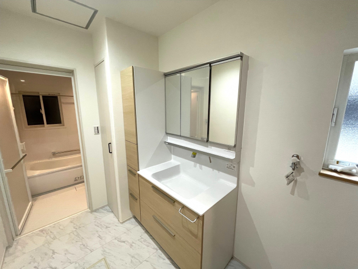 お掃除ラクラク、鏡の後ろにもたっぷり収納できるシャンプードレッサー。