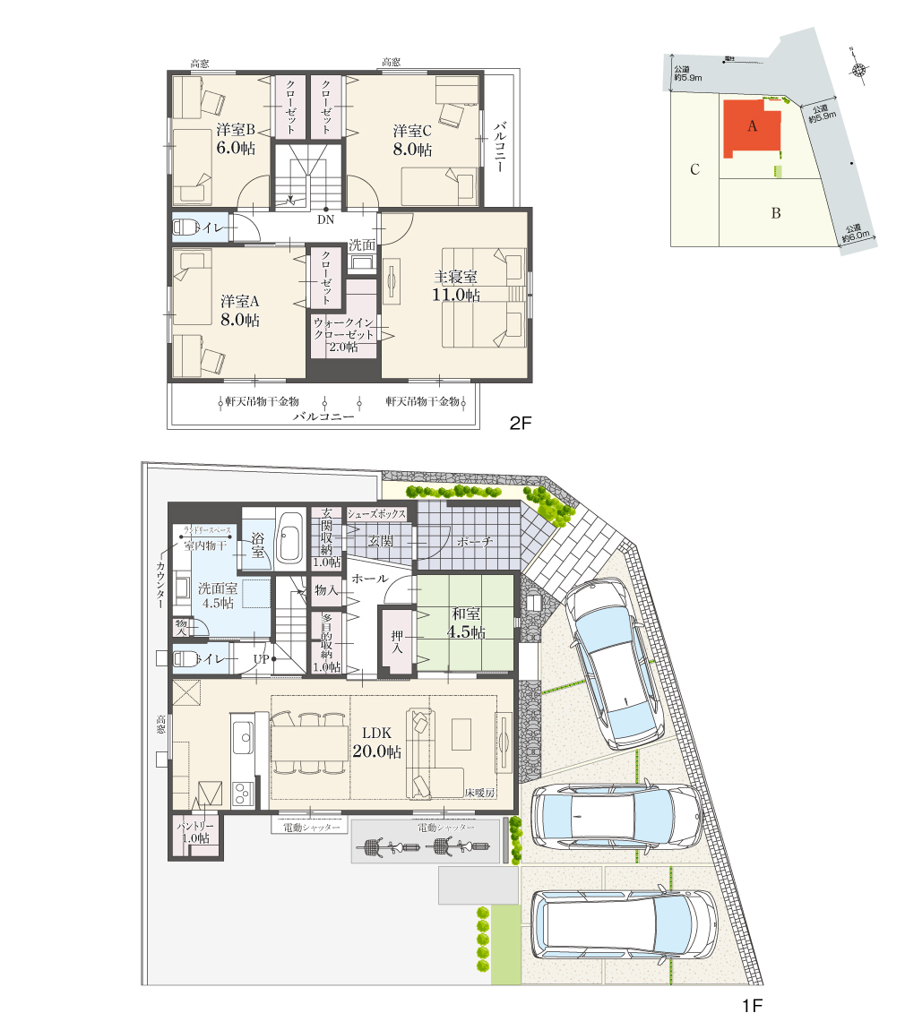 ・駐車台数は、区画図または各間取り図に表示の自動車サイズを想定しております。車種によっては駐車台数が異なる場合があります。
