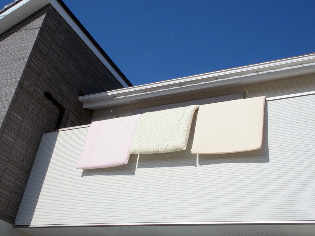 厚手のお布団もバルコニーの手すりなどにしっかり留められて、