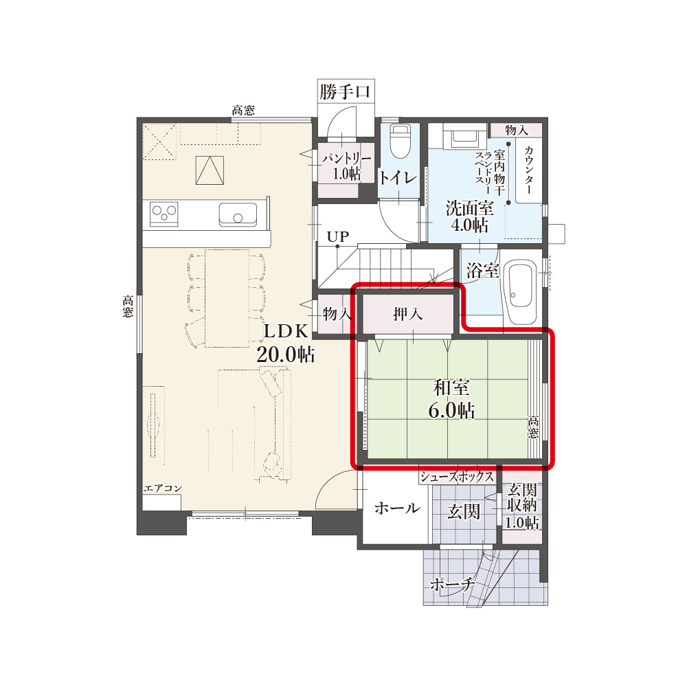 狭い家ではデッドスペースになりがちですが、広さにゆとりのあるエサキホームの家なら、リビングの快適さを損なわずに和室のメリットを享受できます。「20帖LDK+和室」という理想的な間取りで、ゆとりある暮らしが実現します。
