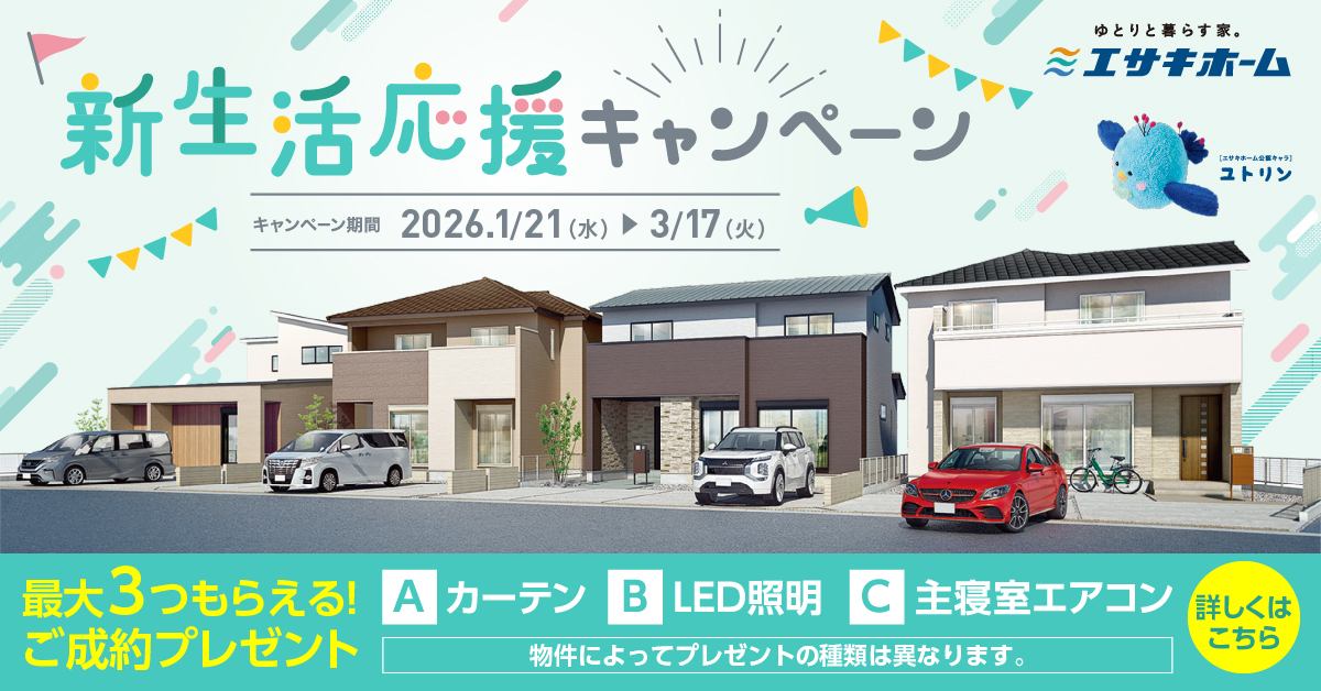 3/17(火)までに対象物件をご成約いただき、3/31(火)までにお引渡しが可能な方に「カーテン」「LED照明」「主寝室エアコン」から最大3つもらえるご成約特典をプレゼントします!