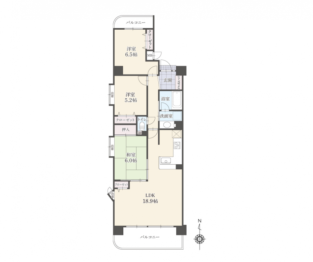 ・3LDK(洋室6.5帖・洋室5.2帖、和室6帖)
