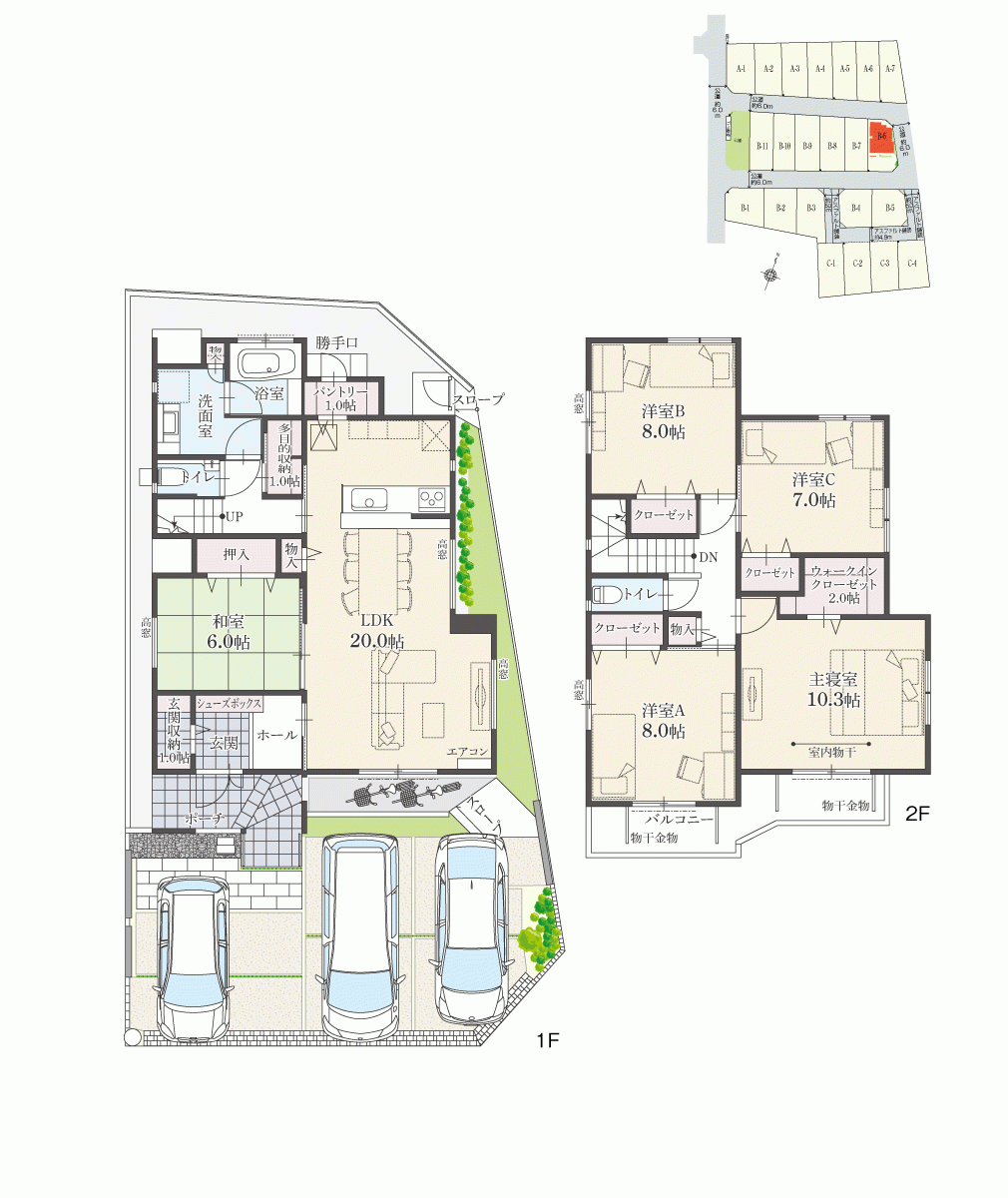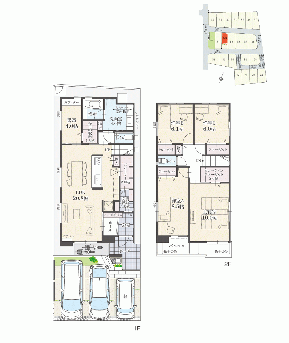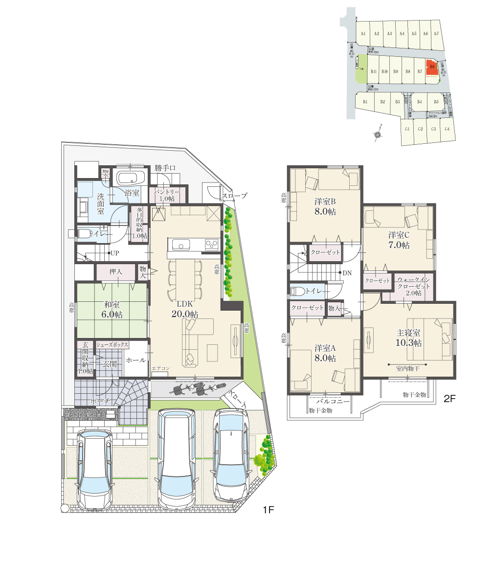 ・駐車台数は、区画図または各間取り図に表示の自動車サイズを想定しております。車種によっては駐車台数が異なる場合があります。