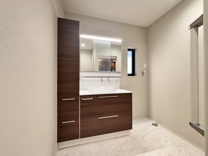 2段引き出しタイプのキャビネットはたっぷりの収納スペースがあるので、収納物がひと目で見渡せます。水栓・すべり台ボウル、タッチレスワイドLED・エコミラーなど工夫がいっぱい。ゆとりある洗面空間を実現。