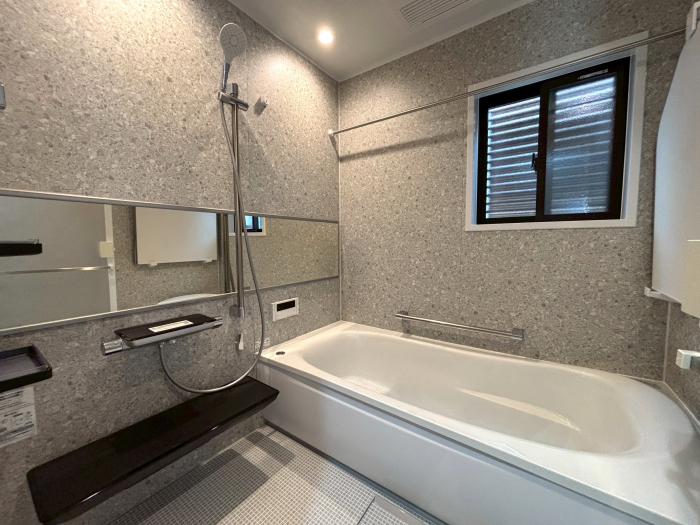 少し大きめ1717(1坪)サイズ。バリアフリー仕様のシステムバス。保温材付きの魔法びん浴槽。お掃除ラクラクほっカラリ床。