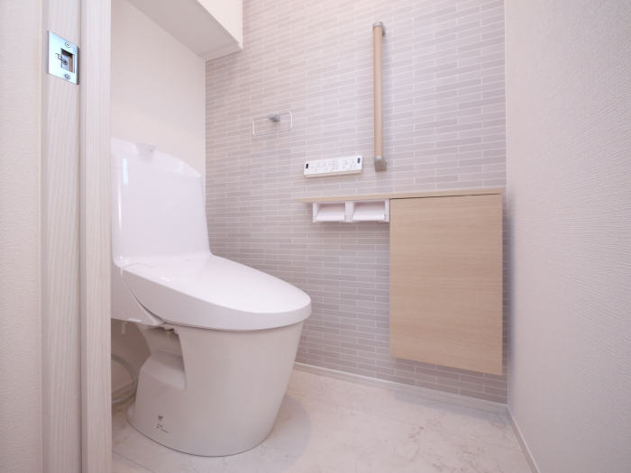 ペーパーホルダー脇の収納キャビネットに加え、備え付け収納を設置。トイレットペーパー(12個入)を袋ごと収納できる奥行を確保しています。