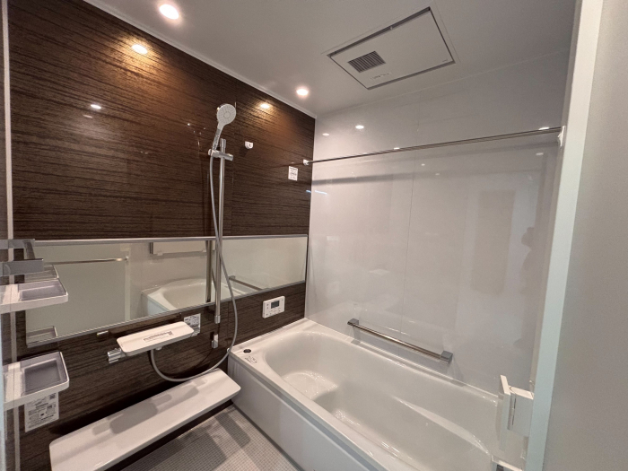 少し大きめ1717(1坪)サイズ。バリアフリー仕様のシステムバス。保温材付きの魔法びん浴槽。お掃除ラクラクほっカラリ床。