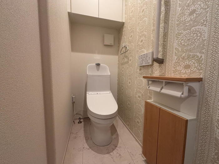 ペーパーホルダー脇の収納キャビネットに加え、備え付け収納を設置。トイレットペーパー(12個入)を袋ごと収納できる奥行を確保しています。