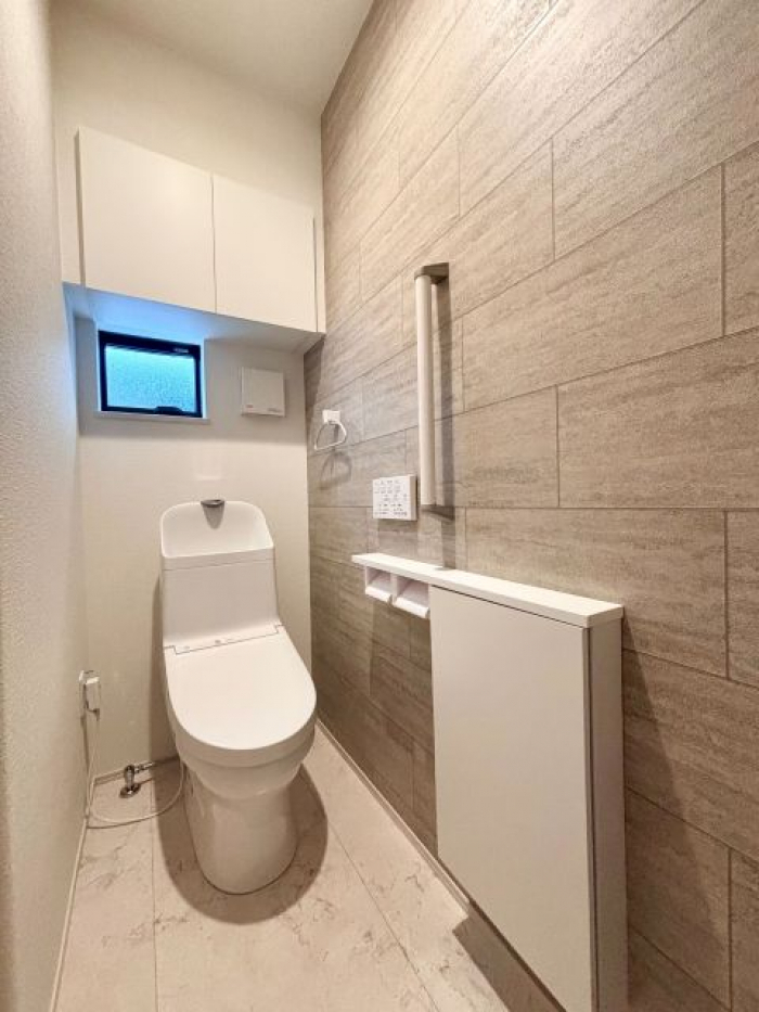 ペーパーホルダー脇の収納キャビネットに加え、備え付け収納を設置。トイレットペーパー(12個入)を袋ごと収納できる奥行を確保しています。