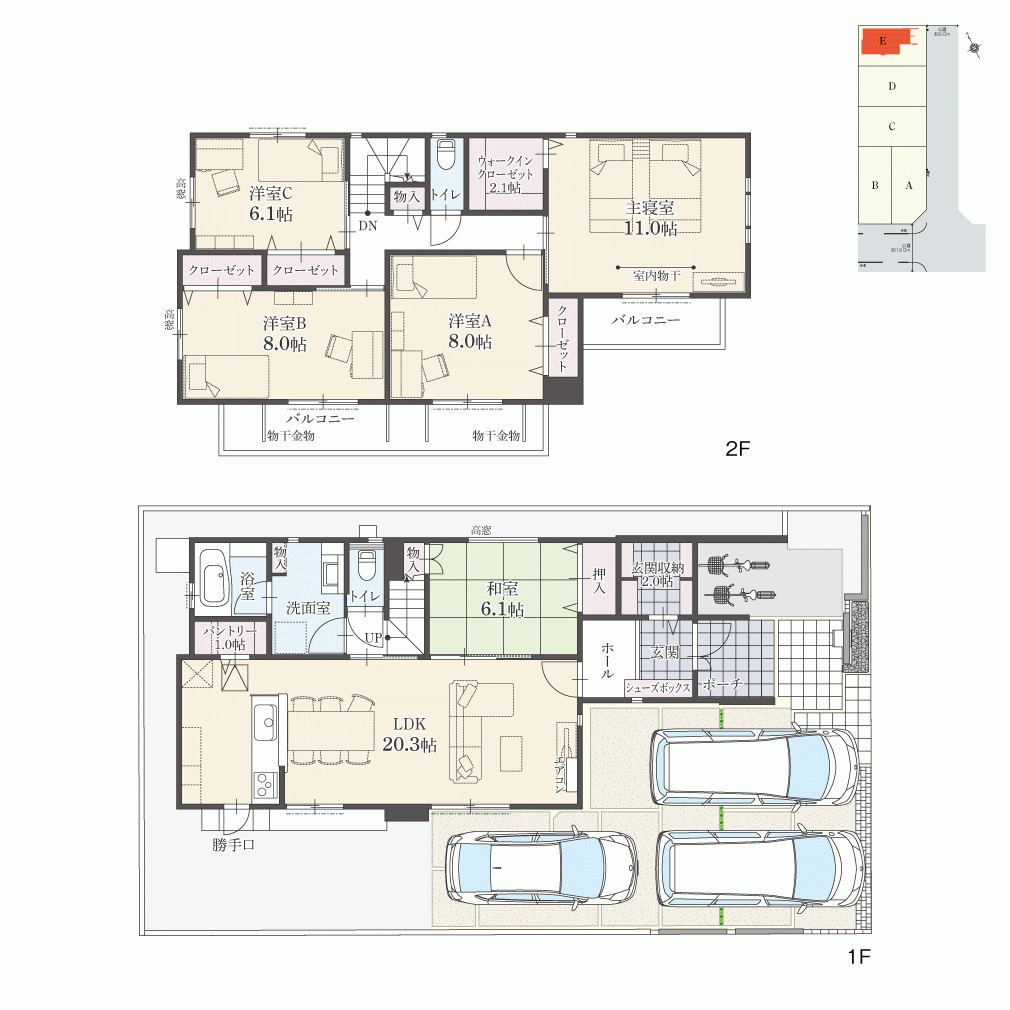 ・駐車台数は、区画図または各間取り図に表示の自動車サイズを想定しております。車種によっては駐車台数が異なる場合があります。