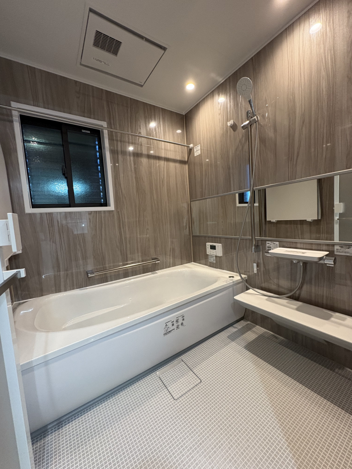 少し大きめ1717(1坪)サイズ。バリアフリー仕様のシステムバス。保温材付きの魔法びん浴槽。お掃除ラクラクほっカラリ床。