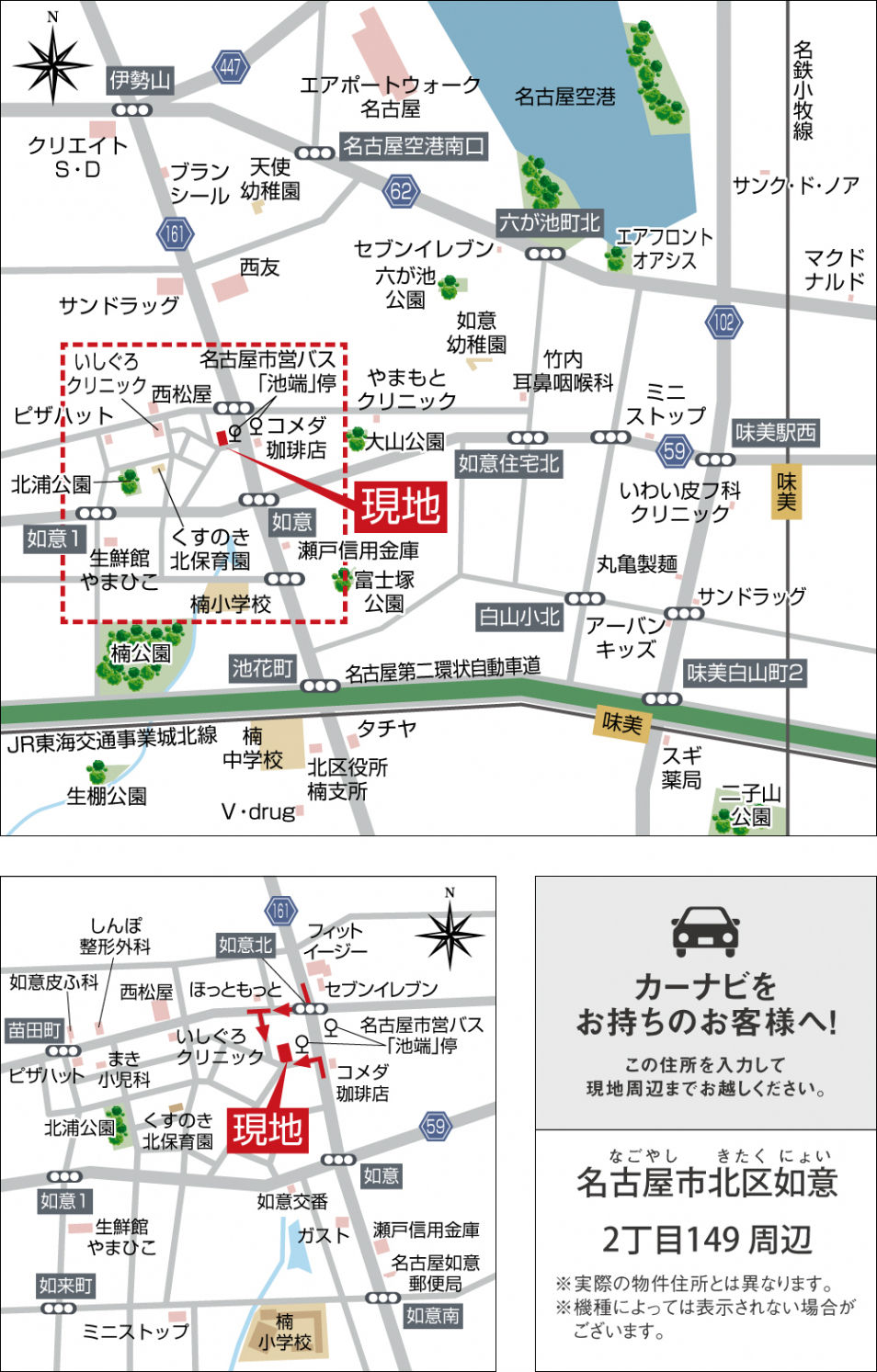 ・所要時間は地図上の概測距離を80m=徒歩1分、250m=自転車1分で計算したものです。